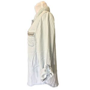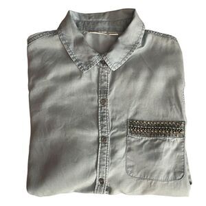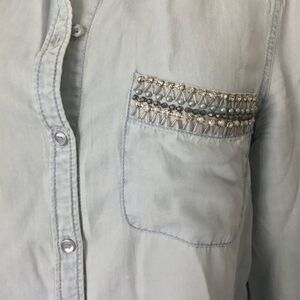 Cato Chambray Shirt. This super soft button down shirt has an beaded embellished front pocket, long sleeves that can be rolled and buttoned, button front.