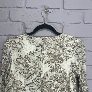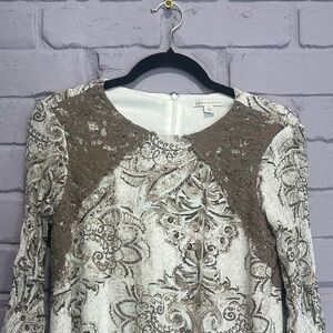 Chic long sleeve dress with intricate lace pattern. Cream base with gold accents. Perfect for formal occasions.