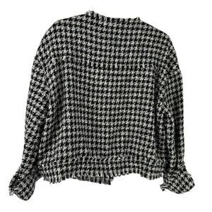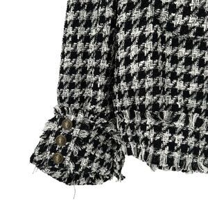 Cato Cropped Collarless Blazer Jacket Houndstooth Tweed Fringe Trim Black & White Preppy Top Ivy League Classic Career Wear Long Sleeve Button Front