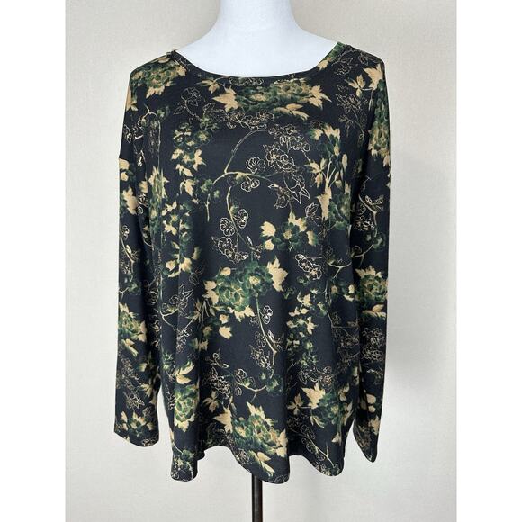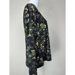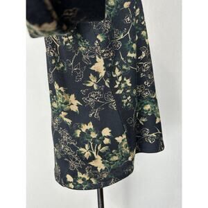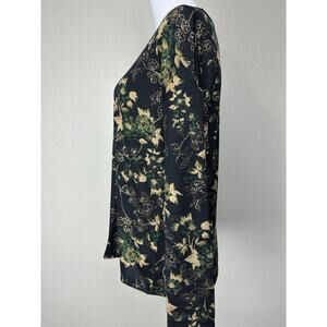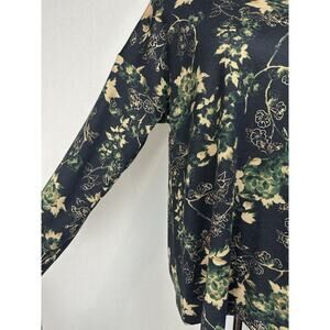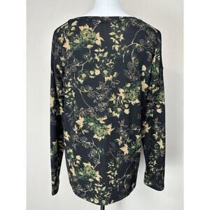 The Cato Est. 1946 Women's Top is a stylish and versatile pullover with long sleeves, perfect for the fall and winter seasons. The blouse features a floral pattern with gold threads, giving it a touch of whimsy and elegance. Made of polyester and spandex, this top offers a comfortable fit with a classic/fitted sleeve design. Suitable for various occasions, from casual to workwear, this top in green, black, and gold colors is machine washable for easy care. Perfect for those looking for a blend of retro, feminine, and hipster styles in their wardrobe.
