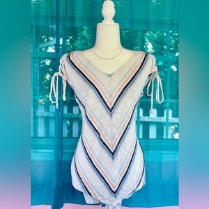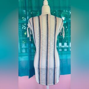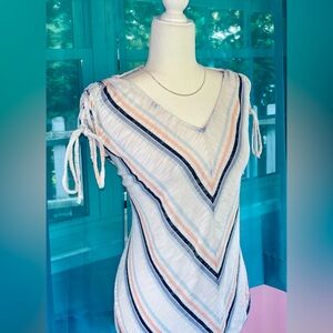 Chic and flattering striped tunic top from Cato Est. 1946. Features a V-neckline, ruched detail and drawstrings / tie details at the shoulders. High-low hem adds shape and style, making this a versatile piece to pair with leggings, jeans, or shorts.