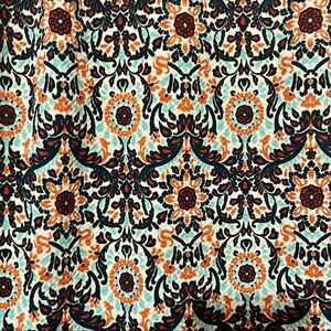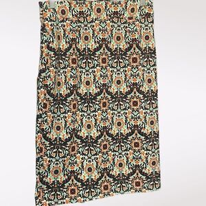 Gorgeous unique print skirt. Colors are blue light blue orange red and black. Has a lot of stretch definitely can fit up to a small. No pockets or zippers.
