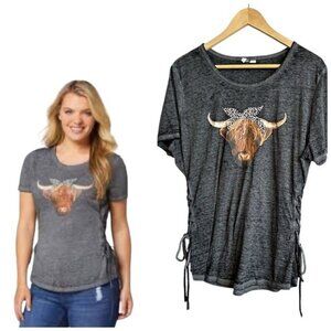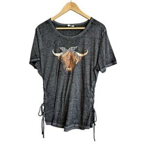 Cato Gray Highland Cow w/ Bandana Laces Up Sides Gray Graphic Tee Size XL