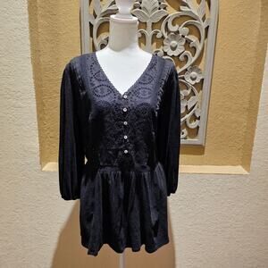 Cato L Black Cotton Blouse Long Sleeve Peplum Boho Cottagecore Eyelet Top
