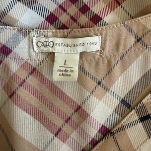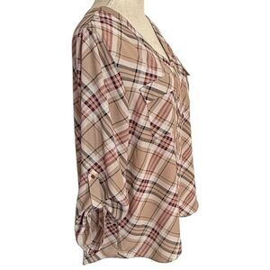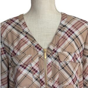 Cato, Lg, Plaid Pullover Blouse, 3/4 Roll Tab Sleeve, Gold 1/4 Zip V Neck, NWOT