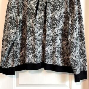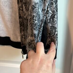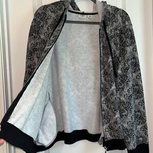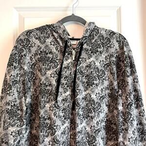 Cato Long Sleeve Medallion Print Hoodie, size 22/24W. Black, gray and white medallion print all over with solid black bands at cuffs and bottom hem. Full zip front, attached hood, side pockets, long sleeves, stretchy fabric.