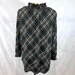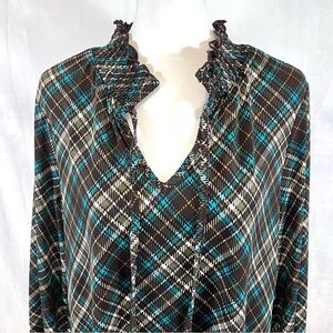 Cato Long sleeve smocked vneck brown and teal plaid top size large