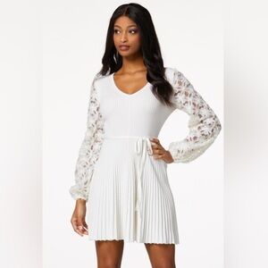 Stunning white sweater dress with sheer floral embroidered long sleeves.