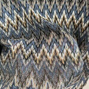Features a stretch sweater-knit outer with a blue, black, white, and tan chevron zig zag pattern and a solid black inner lining for coverage and comfort.
