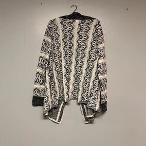 Elegant Cato cardigan with geometric design. Features black and white tones. Perfect for layering.