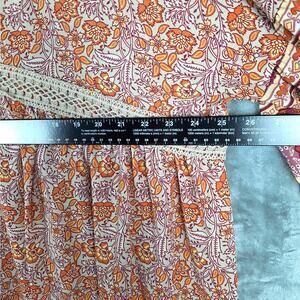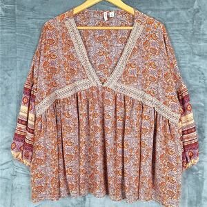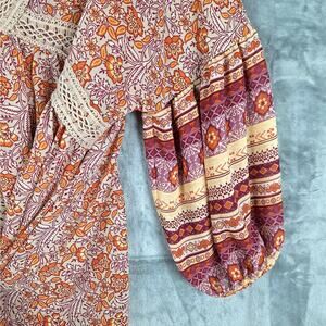 Bohemian style blouse with intricate patterns. Features a V-neck with lace trim. Loose and flowy fit. Perfect for casual wear.