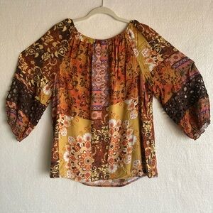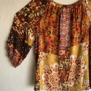 Stylish bohemian blouse with floral and geometric patterns. Features a mix of brown, gold, and orange tones. Perfect for casual outings.