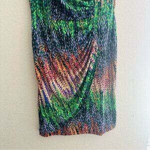 Bold sleeveless midi dress with a dynamic pattern. Features rich shades of green, orange, and blue. Perfect for making a statement.