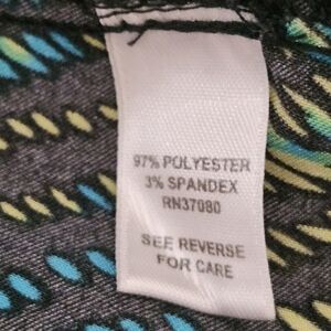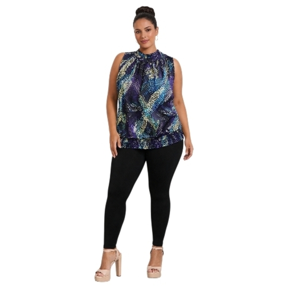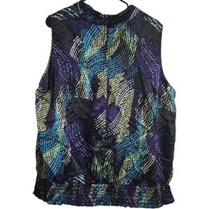 Beautiful Cato Woman sleeveless peplum top in a bold abstract print featuring shades of purple, teal, black, and chartreuse. Designed with a high round neckline and a flattering peplum hem that adds shape and flow. Made of a comfortable stretch fabric (97% polyester, 3% spandex). Perfect for casual wear, office, or dressing up with a blazer or cardigan.