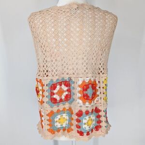 This stylish vest by Cato showcases a beautiful lacy crochet pattern in cream, enhanced by a colorful granny square design in red and other vibrant hues. The sleeveless and open front style makes it an ideal layering piece for a variety of outfits.