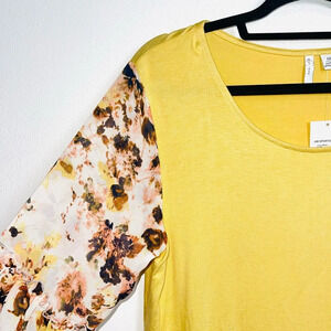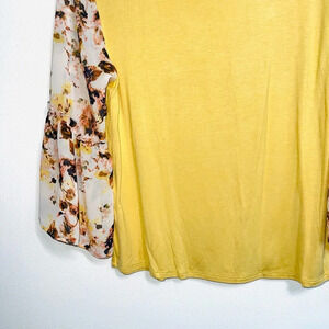 Brand new Cato yellow & cream floral print contrast top. New with tags & in perfect condition! Scoop neckline. Long bell sleeves. Contrast cream, yellow & brown floral print. Blouse material for the sleeves. Jersey knit body. Soft yellow color. Size medium.