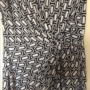 Definitely a work dress - the modest neck line and length and cap sleeves that sit just on the shoulders is too cute. I don't know if it was the material or the pattern or maybe that awesome Knot/twist in the front but this dress made my ASSets look Ahh-mazing!! A emerald cut pattern in black and white with fun knot that draws away from your mid-section (in case you were like me and had a little extra loving around the middle) this is the most comfortable and still sexy dress to work all day in!
