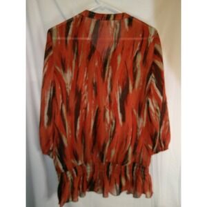 Keywords: Cato, orange blouse, brown blouse, abstract print, ruffle blouse, sheer top, womens blouse, long sleeve blouse, button down blouse, casual blouse, dressy blouse, bohemian style, boho chic, lightweight blouse, size large