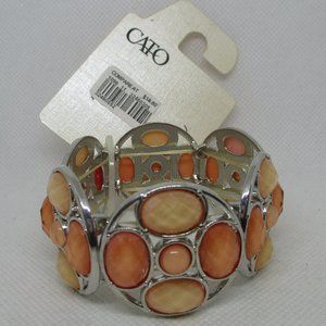 Never Worn Cato stretch bracelet with original tag and price. Peach and orange plastic faceted oval and round cabochon faux gemstones set in circular inserts stretch bracelet.