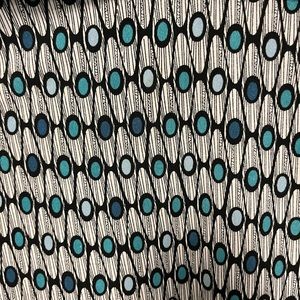 Multicolored patterned top with black trim and tie in the back. Polyester/ spandex blend fabric with lots of stretch. From Cato Size Large. Non-smoking home.