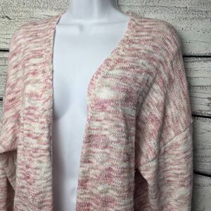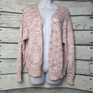 Cato women’s open-front cardigan, size Large. Soft pink and cream marled knit design, relaxed fit, and ribbed trim. 76% cotton, 24% acrylic. Lightweight yet cozy layering piece for any season.