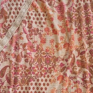 This charming blouse from Cato features a delightful mix of pink and cream hues in a floral and geometric design. The flutter sleeves and relaxed silhouette offer a breezy feel, perfect for warm days. Its light fabric and curved hemline add a touch of elegance to any casual outing.