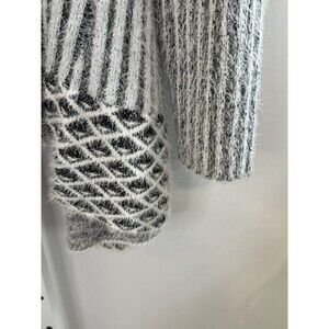 This open-front fuzzy knit sweater features vertical gray-and-white stripes that flatter the figure, while the diamond-pattern trim adds a modern touch of texture.
