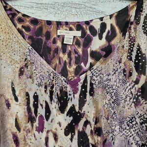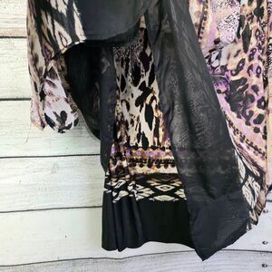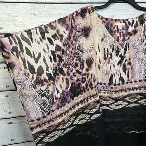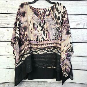 Cato women’s plus size poncho blouse in purple, tan, and black abstract animal print. Flowy poncho silhouette with sheer overlay and black lining. Fabric: 100% polyester shell, contrast 96% polyester/4% spandex. Size 22/24W.