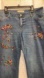 Stylish blue jeans with colorful rhinestone embellishments. Perfect for adding a pop of color to your wardrobe.