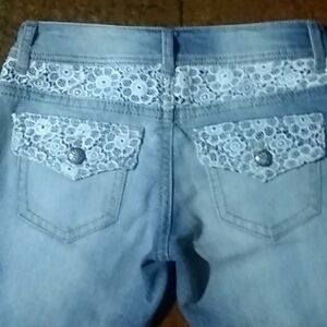 Cato Premium Modern Bootcut Jeans with Whiskering and Plenty of Fading. Floral Lace Design with Back Flap Button Pockets and Rhinestones on Front Pockets. Excellent Condition. Smoke free home.