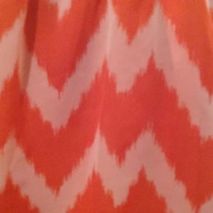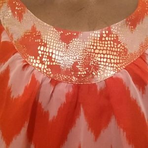 Orange/White Stripe-Scoop Neckline-Sleeveless-Gold Snake-like Pattern -around Neckline-Straps-and back top area-Two Orange button closures at top in back neck area-Beautiful Blouse!!!!Has Orange solid Lining-measures 28 inches long