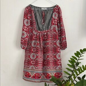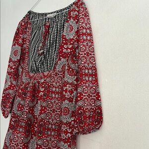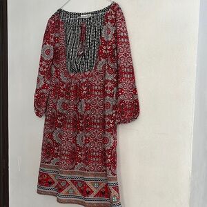 This Cato sundress features a vibrant red and black color palette, perfect for casual or resort wear. The dress boasts a scoop neckline and elegant 3/4 bishop sleeves, offering a stylish and comfortable fit. Ideal for a relaxed day out, this dress combines fashion with ease.