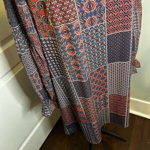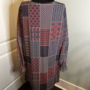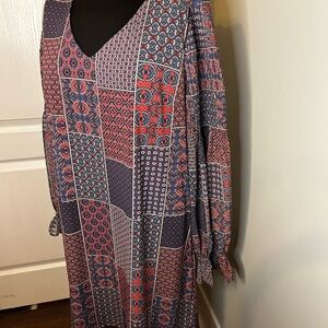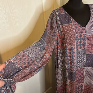 Est 1946 Patchwork Lined Balloon Sleeve Multicolor V Neck Midi length Shift Dress Womens XL. Pit to pit 22.5”. Length from shoulder to hem 37”. Excellent used condition.