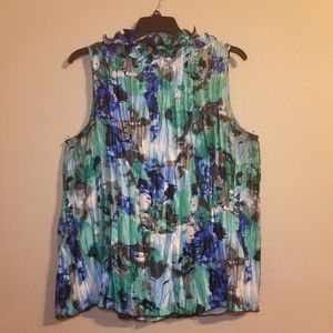 Full of front ruffles. Ruffles also around the back of the neck. Buttons down the front. Light, scrunchy polyester fabric. Great used condition. Size 22/24