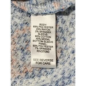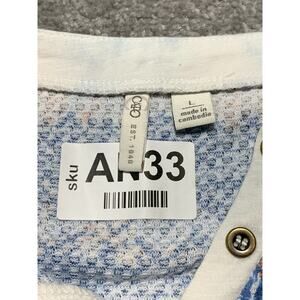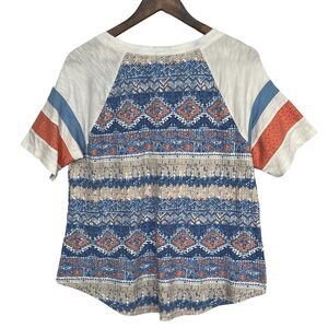 Cato Shirt Top Women Size L Blue White Printed Patterned Stretch Popover Raglan Short Sleeve STAINS Polyester Rayon Spandex