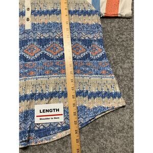 Cato Shirt Top Women Size L Blue Printed Stretch Popover Short Sleeve STAINS
