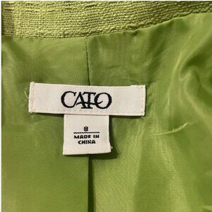 Cato. Size 8. 3/4 sleeve. Linen Rayon Lined Green Jacket Top Shacket. Shoulder to hem 22.5". Sleeve 16". Bust 18/36". Dry clean. Back belt detail. Poly lining.