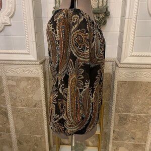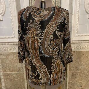 Cato. Size Large. Peasant Style Raglan Sleeve Semi Sheer Chiffon Pullover Top. Elastic at wrist. Polyester. Paisley. Center back 24.3". Raglan sleeve 19.5" taken from neck. Bust 41". Excellent pre-loved condition. No spots, tears or damage.