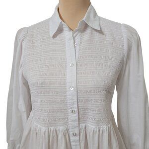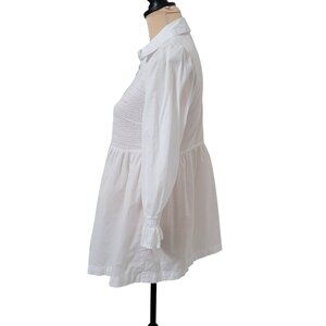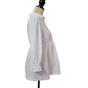 Cato Size S White Smocked Bodice Babydoll Blouse, Long Sleeve with Ruffle Cuffs