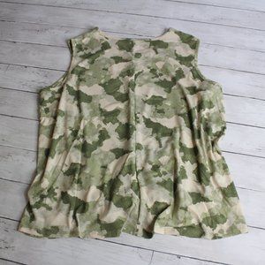 This roomy sleeveless top is green and cream with a twist front hem. One side of the blouse is paisley floral and the other side is camouflage with a camouflage back. It is brand new with tags.