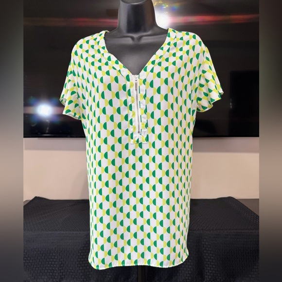 This Cato blouse features a relaxed fit with a spring green and white color scheme. The zipper adds a touch of elegance, making it perfect for casual outings. Its lightweight fabric ensures comfort and breathability throughout the day.