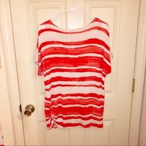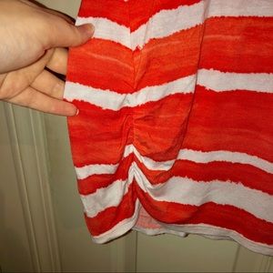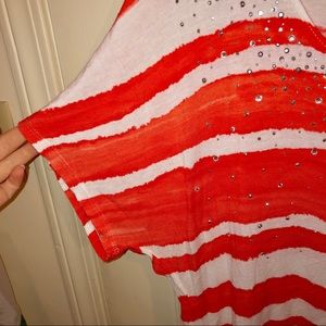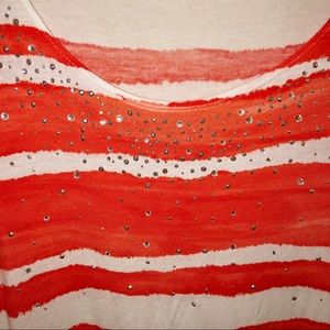 Orange and white striped top with rhinestones around the neck. There is a tiny spot of discoloration on one of the white strips (seen in the photo). Smoke free home! Offers are welcome!