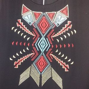 Organza type of material. Sheer - great swimsuit cover up or pair with turtle neck and jeans as tunic.
