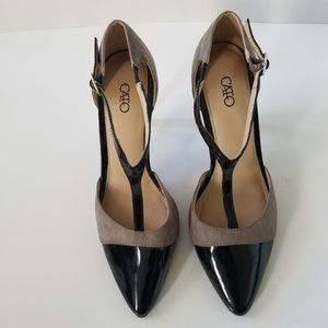 Cato vintage gray taupe and black suede and patent leather t-strap are in a size 8. The vintage 3 1/2-inch patent leather heel has a patent leather pointed toe. The heels have a faux suede man-made upper. The heels are pre-loved and in great condition only been worn a couple of times.