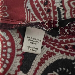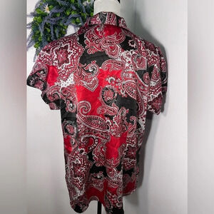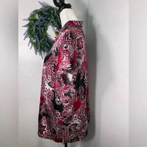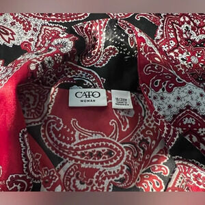 Cato Woman, 18/20W, Asian inspired geometric print satin finish caplet short sleeve gathered shoulders, hidden button front with collar, hem slits blouse
