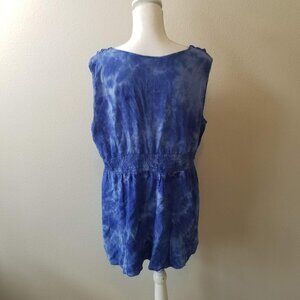 plus size top, tie-dye shirt, casual summer top, Cato Woman top, 18/20W blouse, elastic waist top, cotton blend shirt, blue and white top, women's casual wear, blue sleeveless blouse, ruffle neckline blouse, lightweight women's top, sleeveless ruffle shirt