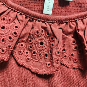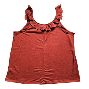 Elevate your summer style with this beautiful Cato tank top in a warm brick red hue. Features delicate eyelet embroidered ruffle trim, a sleeveless cut, and a soft, breathable knit. Effortlessly pairs with jeans, skirts, or shorts for a relaxed boho vibe. Size Medium, true to size.