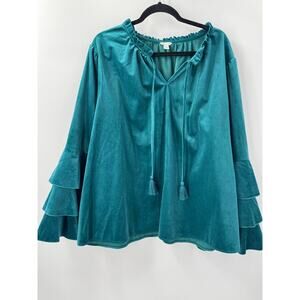 Cato Women's 22/24W Teal Velvet Ruffle Bell Sleeve V-Neck Tassel Dressy Blouse