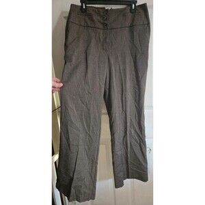 These are Cato women's dress pants in a light muted brownish color, featuring a wide-leg style and an adjustable waist (in the back you can tighten it). They are made of polyester, spandex, and rayon, with a closure of buttons. These pants are a size 14 regular fit, suitable for various occasions such as parties, workwear, and business attire. The garment care instructions indicate they are machine washable.