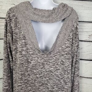 Cozy gray marled knit sweater with a relaxed fit and unique open cowl back detail. Soft and stylish for casual wear.